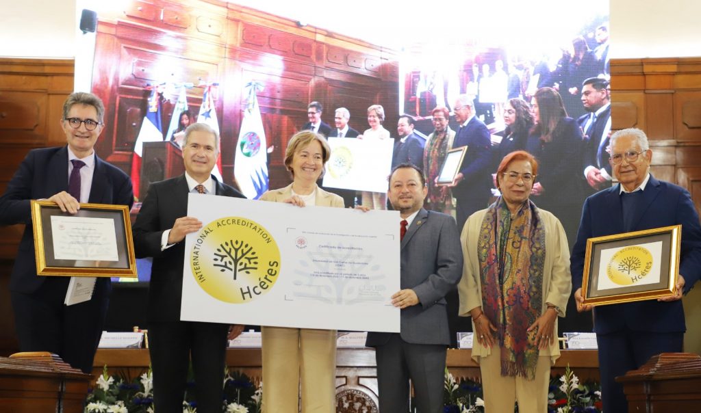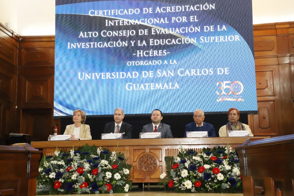 La Universidad de San Carlos de Guatemala recibió la acreditación internacional otorgada por el Alto Consejo de Evaluación de la Investigación y la Educación Superior (Hcéres), cuya certificación fue entregada en un acto solemne realizado en el Museo de la Universidad de San Carlos (MUSAC), en el marco de la conmemoración de sus 350 años de historia.